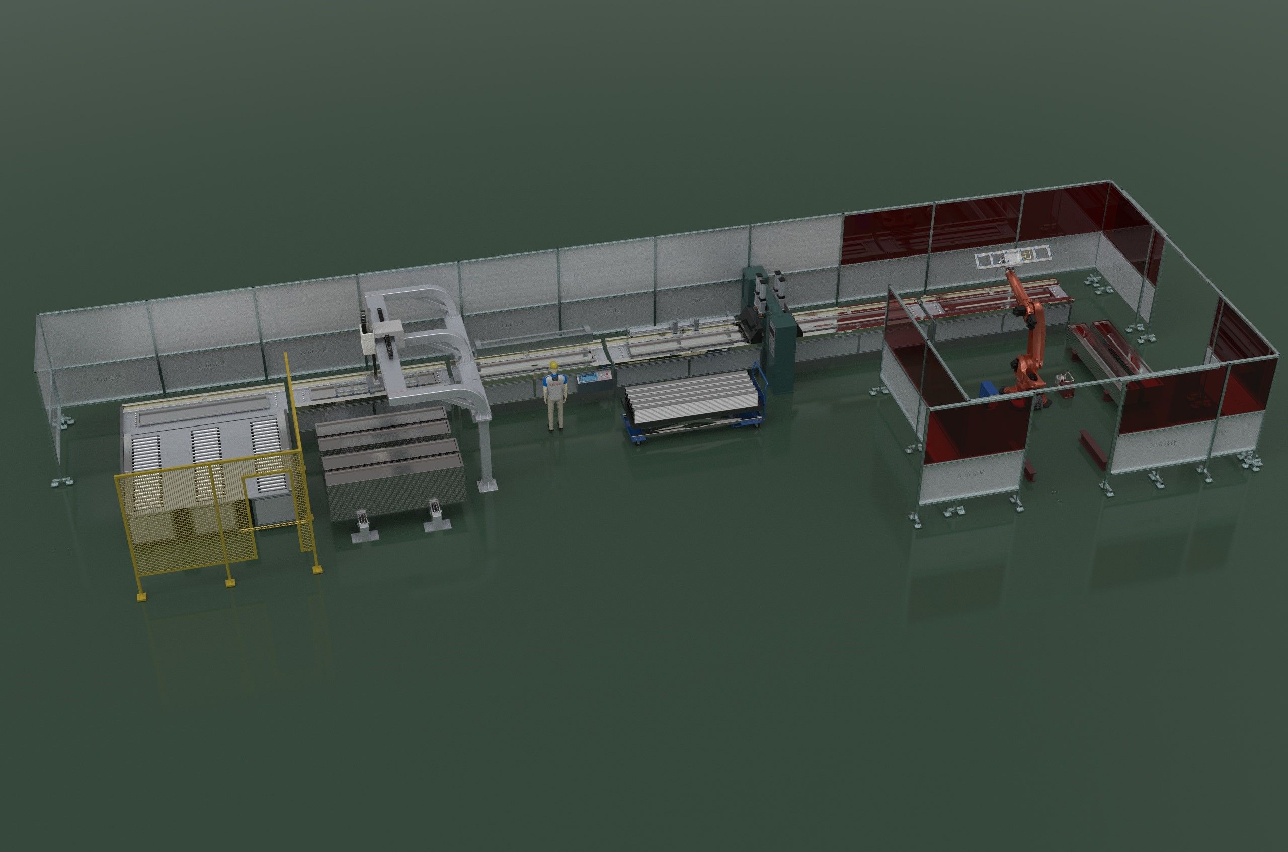 5、焊機及成品下料區(qū): 通過設(shè)備進行自動焊接,焊接高度小于門板鐵皮高度,當(dāng)焊接完成后,機器人工位自動翻轉(zhuǎn),使用吸盤進行自動取下,按預(yù)定軌跡進行堆放,當(dāng)一個成品料堆,堆放達到指定要求時,系統(tǒng)給予提示,并自動選擇另一個堆放平臺進行下料,保證下料料堆更換線體不停機。機器人選用庫卡 KR210R2700EXTRA。